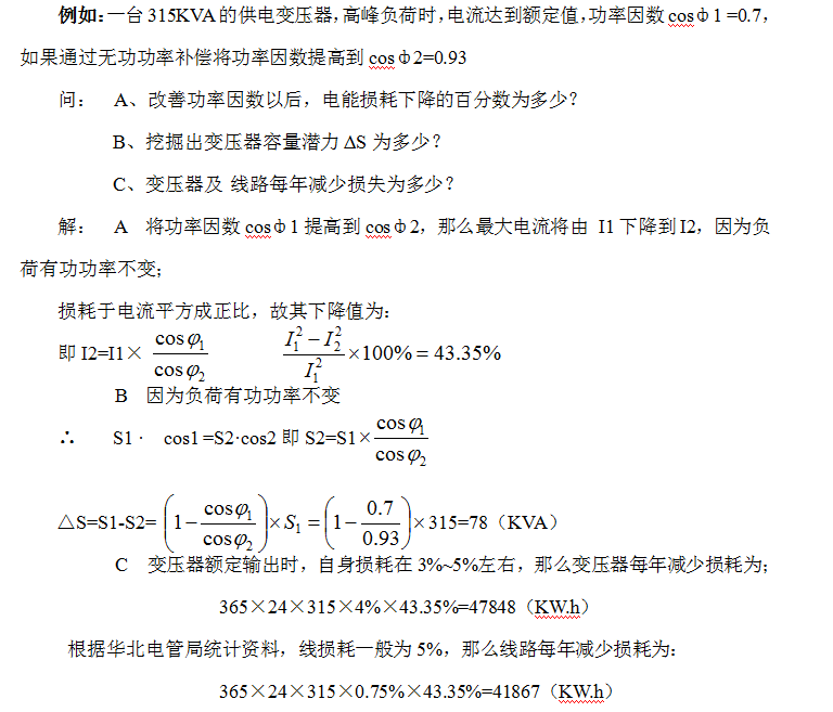 S'il y a une capacité insuffisante dans les transformateurs et les lignes, la méthode d'installation des dispositifs de compensation de puissance réactive peut être utilisée. L'installation de dispositifs de compensation de puissance réactive peut équilibrer la puissance réactive localement, réduire le courant circulant dans les lignes et les transformateurs, ralentir la vitesse de vieillissement du fil et de l'isolation du transformateur et prolonger leur durée de vie. Dans le même temps, il peut libérer la capacité des transformateurs et des lignes, augmentant ainsi leur capacité de charge. Par exemple, avec un transformateur de 100 KVA fonctionnant actuellement à 85 % de charge avec un COSΦ de 0,7, l'installation d'un équipement de compensation de puissance réactive peut augmenter la capacité de charge du transformateur de 30 %. Les utilisateurs peuvent augmenter leur charge sans augmenter la capacité pour faciliter une nouvelle expansion de la production.