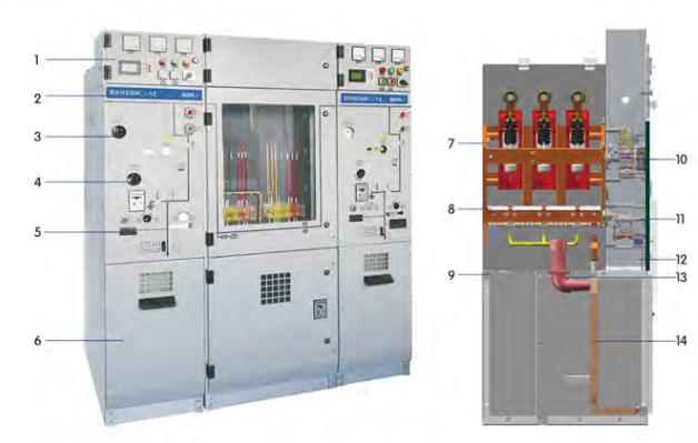 11. Mécanisme à trois stations. Mécanisme de verrouillage à cinq épreuves 13. Ligne d'entrée et de sortie à travers le boîtier mural 14. Le busbar
