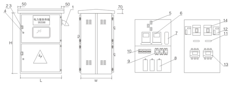 1. Câble d'entrée à travers le tuyau 2, serrure de porte (verrouillage ouvert) 3, boîte de pluie de serrure de porte 4, serrure de porte (verrouillage caché) 5, transformateur de courant 6, compteur 7, boîte de jonction 8, condensateur 9, commutateur de contacteur fusionné 10, petit disjoncteur 11, interrupteur d'isolement 12, transformateur à séquence zéro 13, disjoncteur à courant de fuite 14, contacteur CA sortant 15, interrupteur d'air sortant